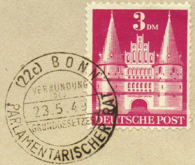 Die Marken waren bis zum 31.1.1951 gültig, also weit bis in die Zeit der Bundesrepublik hinein. Viel bekannter sind die sogenannten Bautenmarken. Sie sind die erste Dauerserie in der Bundesrepublik. Die Mark-Werte wurden zusammen mit den späteren Posthornmarken verwendet bis zum gemeinsamen Gültigkeitsende am 31.12.1954. An der dargestellten 3DM-Marke ist natürlich der Sonderstempel "Verkündung des Grundgesetzes" von besonderem Interesse. Nach dieser Einstimmung plane ich noch detaillierte Ausarbeitungen zu den Themen: