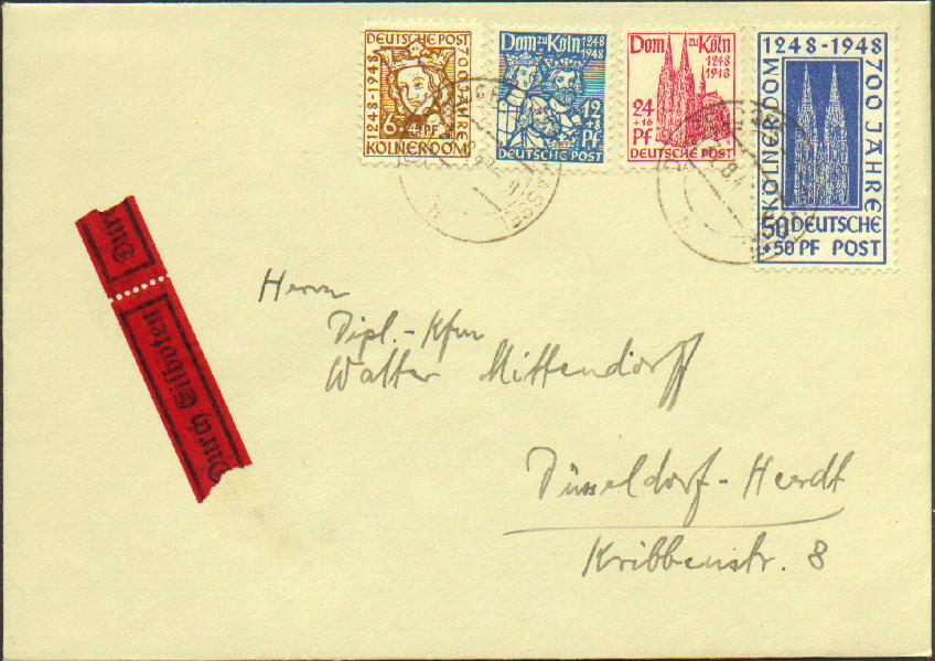 Die Bizone entstand aus dem Zusammenschluss der Amerikanischen und der Britischen Besatzungszonen. Für diese beiden Gebiete erschienen gemeinsame Ausgaben, welche, beginnend mit der Sonderausgabe zum 700. Jahrestag des Kölner Doms vom 15.8.1948, die ersten Marken darstellten, die in der Bundesrepublik Deutschland Gültigkeit hatten.