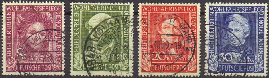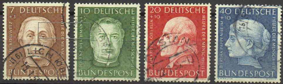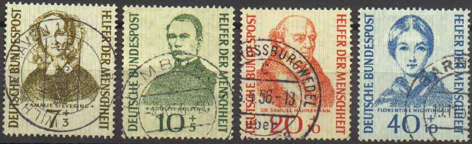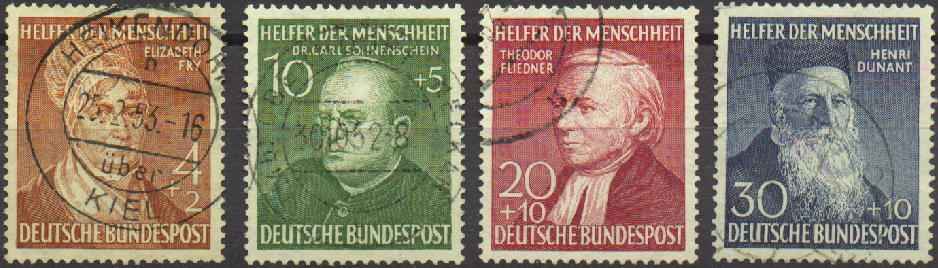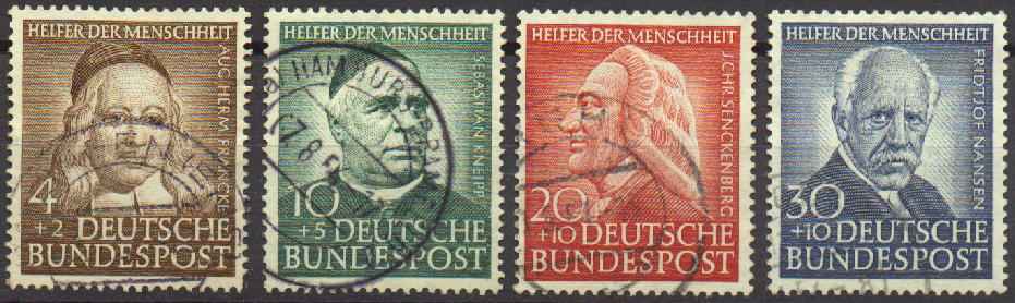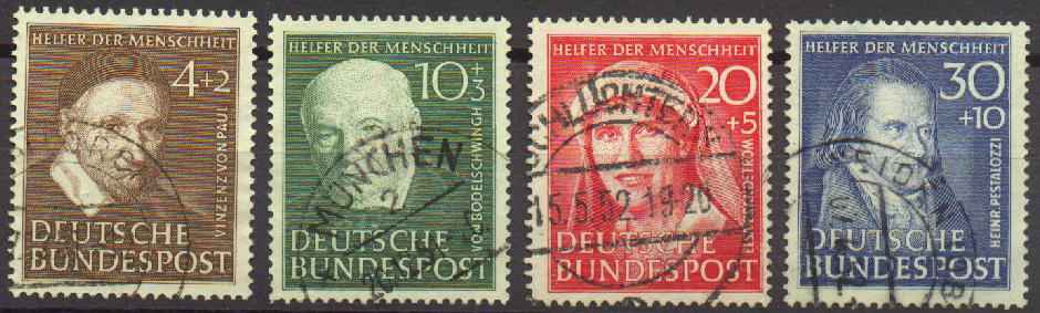 Helfer der MenschheitSeit 1949 gibt es in der Bundesrepublik Wohlfahrtsmarken. Sie sind ein fester Bestandteil eines jeden Jahresprogramms. In den ersten Jahren war das Thema dieser Serien "Helfer der Menschheit". Abgebildet wurden Persönlichkeiten der Geschichte, die sich durch ihre Taten zu Gunsten der Allgemeinheit einen Namen gemacht haben. Philatelistisch sind diese Marken von Interesse, weil sie einen signifikanten Beitrag zum Wert einer gestempelten Bund-Sammlung beitragen. Bei einigen Marken gibt es katalogisierte Besonderheiten. 19491951