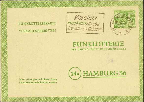 Parallel zu den regulären Postkarten erschienen insgesamt vier Funklotterie-Postkarten. Die Auflagen unterscheiden sich im aufgedruckten Verkaufspreis, in der Adresse und in anderen Merkmalen:
