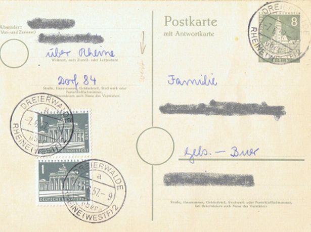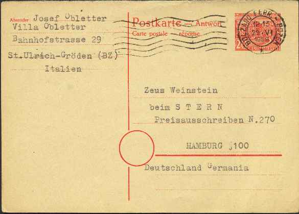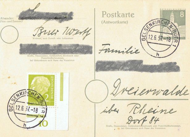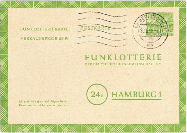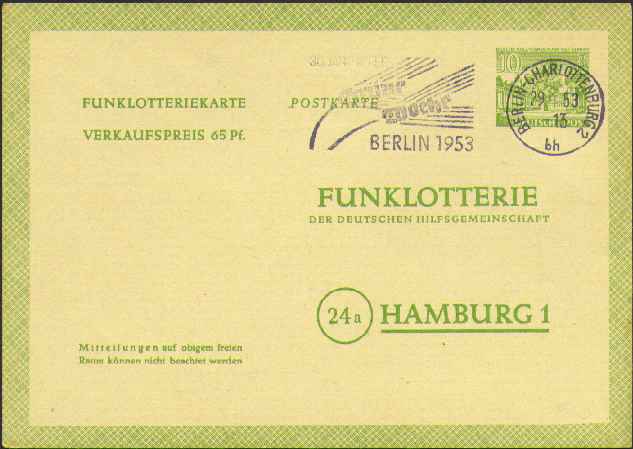 Offensichtlich wurde jemand direkt bei der Lotterie-Gesellschaft angesprochen. Ob er die Karte bekommen hat? Was mag wohl hinter der Formulierung "einen letzten Gruß" stecken? Die Karten aus den Jahren 1956 bis 1962 tragen die Wertstempel "Berliner Bauten II". als Beispiel dient die P33, eine Ortspostkarte mit Antwortkarte, die in Westdeutschland mit Zusatzfrankatur verwendet wurde. In dieser Form macht sie sich natürlich sehr gut in meiner Sammlung.