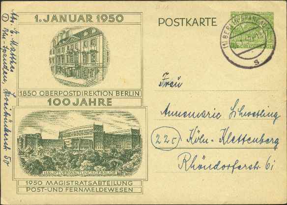 und zwar einmal als einfache Postkarte und dann noch mal jeweils als Antwortkarte. Antwortkarten bestehen aus einem Frageteil und einem Antwortteil. Letzterer dient dazu, dem Empfänger eine aus seiner Sicht portofreie Antwort zu senden. Das war auch für Auslandskarten möglich! Sie tragen dafür zusätzlich den Aufdruck Carte postale - réponse in Französisch, der Weltbriefsprache! Hier die Antwortkarte im Auslandsporto, verwendet aus Italien. Interessanterweise wurde sie erst 1959 verwendet, obwohl der Wertstempel nur bis zum 31.12.1958 gültig war! Die ersten beiden Karten zu 8 und 10 Pf. (Michel-Nr. P4 und P5) gibt es in zwei Farben: Hellgelb (a) und Grauweiß bis Sämisch (b). Eine ganz große Rarität in meiner Sammlung wäre eine P5 verwendet als Ortspostkarte in der Zeit vom 23.5. bis 31.5.1949. Vielleicht kommt mir ein solches Stück doch einmal unter?! Die nächsten beiden Karten erschienen 1950 zum 100jährigen Bestehen der Oberpostdirektion Berlin. Es waren Sonderpostkarten mit einem entsprechenden Zudruck.