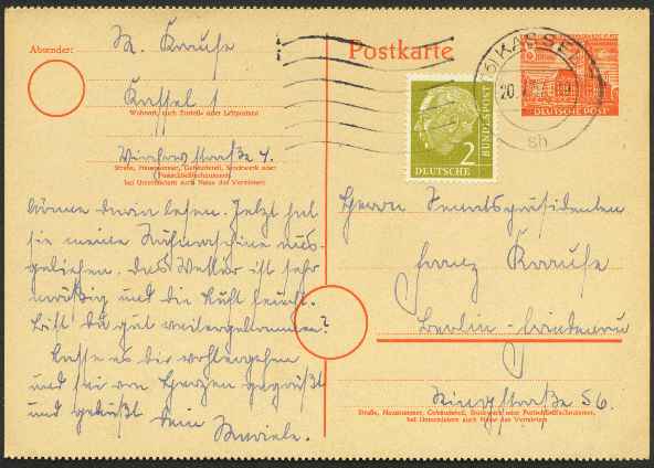 Im Michel sind außerdem sogenannte gezähnte Ausgaben dieser zweiten Auflage notiert! Die Zähnung rührt von einer Perforation her von zusammenhängend hergestellt Karten. Der "Zusammendruck" war ein besonderer Service der Post. Die Karten konnten so leichter in eine Schreibmaschine eingespannt und beschrieben werden. Das gezeigte Beispiel ist nun gerade nicht auf diese Weise verwendet worden, doch ein anderes Beispiel habe ich zurzeit nicht, da die gezähnten Karten sehr selten sind. Ebenfalls neu aufgelegt wurden auch die Antwortkarten zu 8 und 10 Pf. 1953 erschien auch von der Auslandskarte zu 20 Pf eine neue Auflage. Für diese Karte wurde jedoch das neue Motiv des Ergänzungswertes aus dem selben Jahr verwendet.