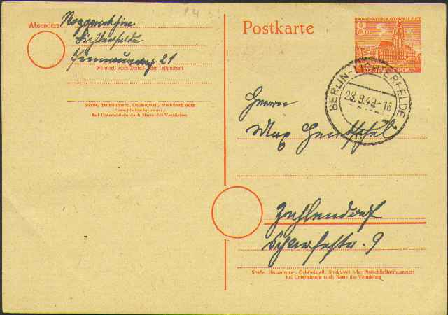 Ganzsachen der Berliner BautenMit Motiven der Freimarkenserie Berliner Bauten erschienen zwischen 1949 und 1955 auch zahlreiche Ganzsachen. Insgesamt sind im Michel 27 Ausgaben notiert! Bei dieser Ortspostkarte kam man sogar ohne Angabe des Ortes bei Absender und Adresse aus. Sie wurde einfach innerhalb des Ortsverkehrs befördert. Die erste Ausgabe von 1949 bot die damals üblichen Portostufen (ab 1.6.1949) für