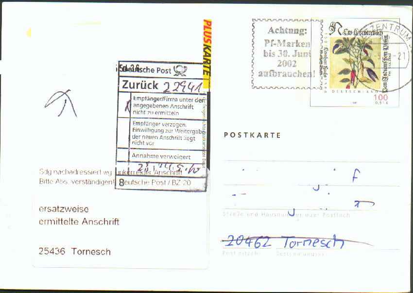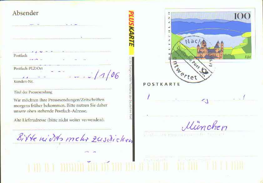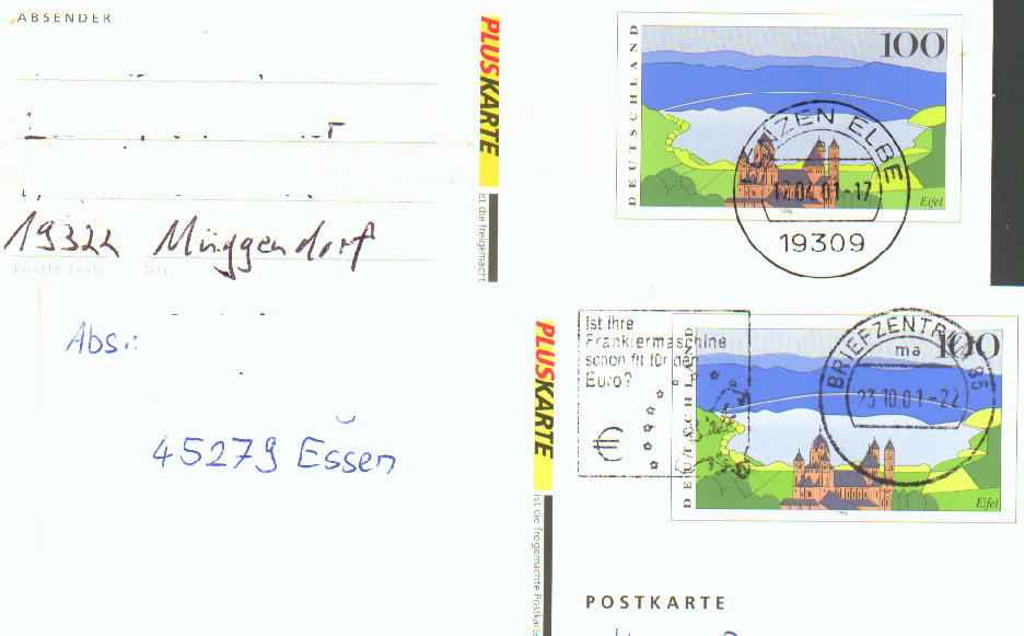 in PLUSKARTE zu erkennen. Später erschien ein weitere Auflage auf rahmfarbenen Papier, wieder in den beiden Varianten: mit und ohne Absendervordruck. Mitte 2004 brachte das neue Motiv "Europa" auf die Pluskarte (PSo