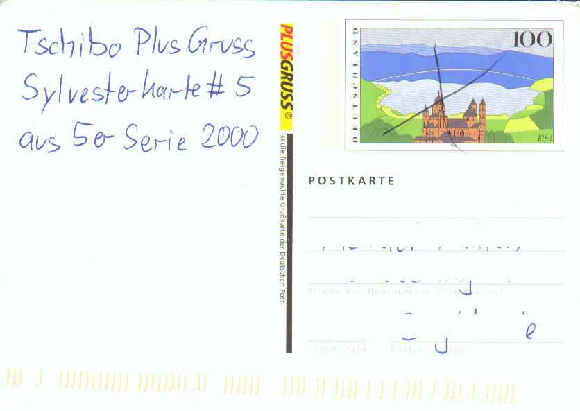 86). Plus GrußkartenKarten dieser Kategorie zeigen den Aufdruck "PLUSGRUSS" und wurden im Format 148 x 104 mm hergestellt. Die Besonderheit dieser Karten ist der Vertriebsweg, über den die beiden bisher erschienenen Ausgaben zu erhalten waren. Sie konnten zu Beginn nur über den Versandservice der Firma Tchibo bezogen werden. Es erschienen zwei Sets mit je 5 Karten (Motiven) zu Weihnachten 1999