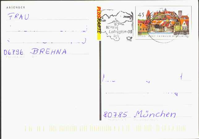 Hier jeweils ein Beispiel. Echte Bedarfspost ist eher selten. Ich wollte die Karten erst in meine Sammlung aufnehmen und gab sie selbst auf den Postweg, um gestempelte (und gelaufene) Exemplare zu erhalten. Leider war das Ergebnis frustrierend, denn vier der insgesamt zehn Karten sahen so aus: